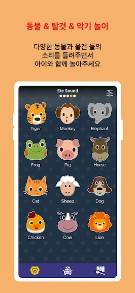 네번째는 동물/탈것/악기소리 입니다. 아기가 6개월 정도 지나고 나면 동물 소리를 좋아 하더라 구요 그래서 저도 사운드 북을 사서 저의 아기에게 들려 줬었는데요 책이 무겁기도 하고 부피도 크고 해서 그냥 어플에 만들어 넣었습니다. 언제 어디서나 스마트폰을 이용해 동물/탈것/악기소리를 들려줘 보세요~^^ (저의 아들은 차타고 이동할 때 동물소리 들려주면 신기해서 계속 집중 하더라구요 ㅎㅎ)