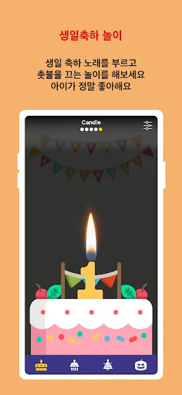 다섯번째는 촛불 놀이 기능입니다. 아기와 함께 케이크의 촛불에 불은 붙이고 끄는 놀이를 하면서 생일 축하노래를 불러보세요, 아기들이 참 좋아해요