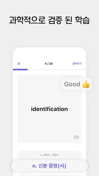 • 단어의 예문과 스마트한 알고리듬이 가장 효과적으로 우리의 영어를 지도해 줄 거예요. 그래서 여러분은 빠르게 단어를 외우고 오래동안 기억할 거예요.