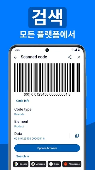 모든 QR 코드와 바코드를 스캔하여 인기 있는 온라인 서비스의 결과를 포함한 추가 정보를 얻으세요; Amazon, eBay 그리고Google - 100% 무료입니다!