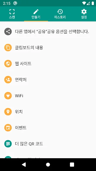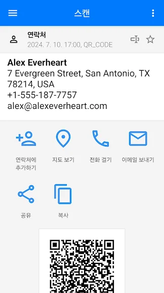 기타 옵션: QR 생성하기, 이미지 스캔하기, 갤러리에서 스캔하기, QR을 통해 연락처 정보 공유하기