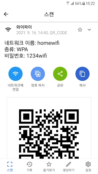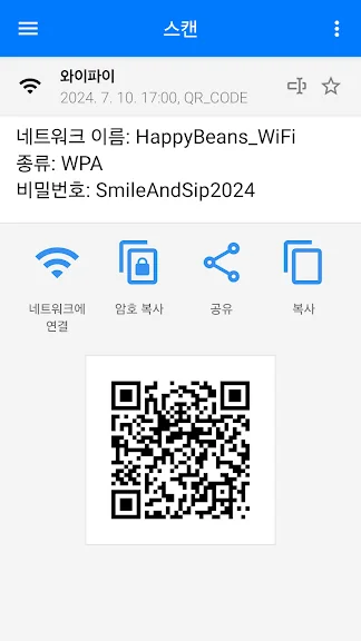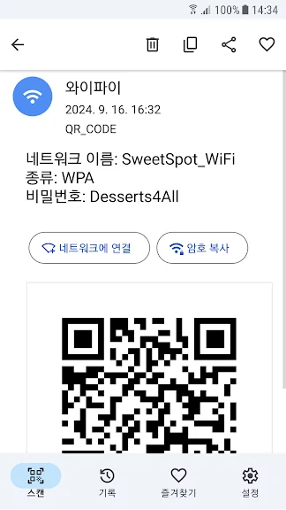 QR & 바코드 스캐너는 Wi-Fi QR 코드를 스캔하여 Wi-Fi 네트워크에 자동으로 연결할 수 있는 기능을 제공합니다.