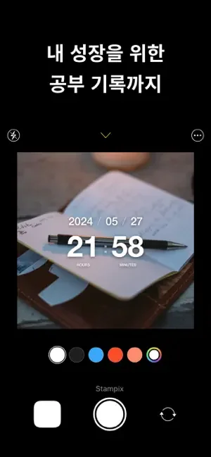 • 스터디인증 - 공무원 시험 (공시), 대기업 공채, 수능, 고시 등을 앞두고 계신 수험생 여러분들. 출첵 퇴첵 스터디 인증사진을 촬영할 때, 타임스탬프를 이용하실 수 있어요. 스터디인증 그룹 채팅방에 참여중일 때, 타임스탬프 사진을 공유해보세요.