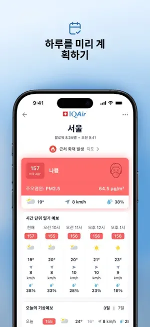 대기질 지수, 미세먼지 농도, 주요 오염물질 수치를 시각적으로 보여주어 언제 공기가 나빠질지, 외출이나 활동 계획을 쉽게 세울 수 있습니다.
