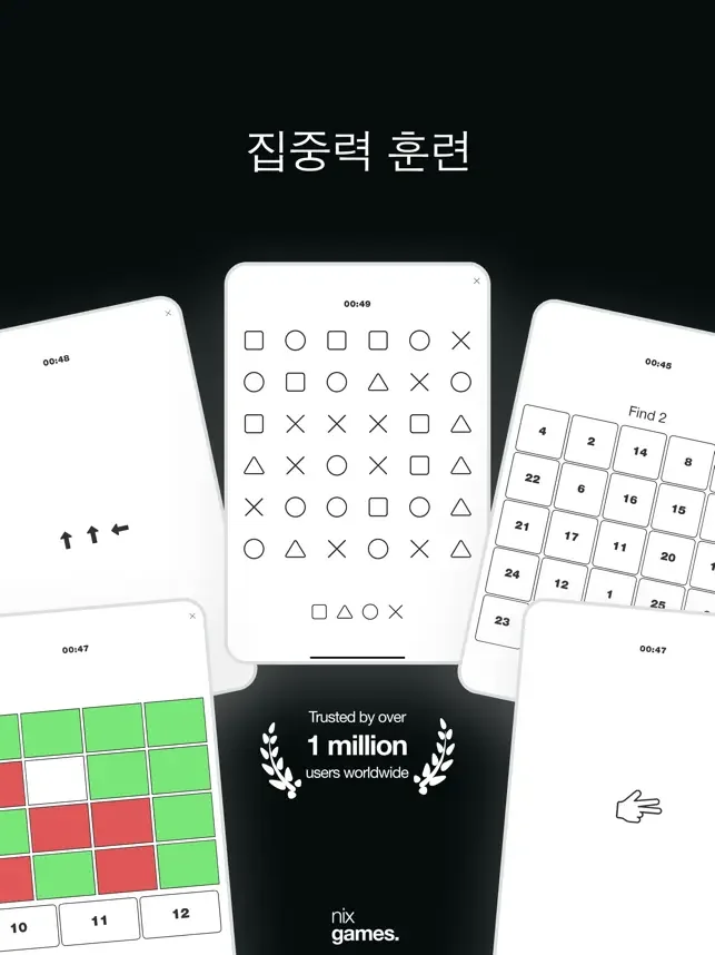 산만하신가요? 앱을 열고 신중하게 설계된 일련의 훈련에 몰입해 보세요. 곧 집중력과 기억력이 향상되는 것을 느낄 수 있을 것입니다. 우리의 훈련은 집중력을 향상시키는 것뿐만 아니라, 논리력, 기억력, 반사 신경을 강화하도록 설계되어 있습니다. 이는 모두 고도의 생산성을 위해 필수적입니다.