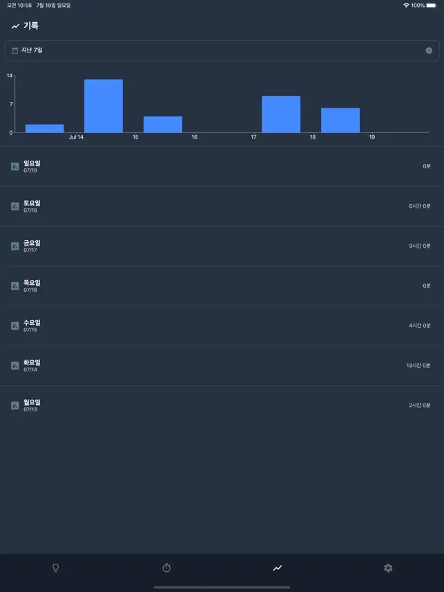 당신이 노력한 시간, 과거 7일간, 과거 14일간의 기록을 막대 그래프로 확인할 수 있습니다. 목표 시간을 만들면 성취감이 더욱더 커질 겁니다! 디폴트 테마에 질리셨다면 다크 모드로 기분 전환을 해 보세요. 기분 전환도 중요합니다.