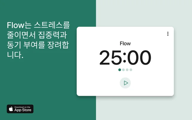 플로우(Flow)는 여러분이 업무 진행 또는 학교 공부를 하거나 그저 일정 시간 동안 방해받지 않고 집중하는 것을 도와 줄 작지만 강력한 어플입니다. 플로우(Flow)는 정해진 휴식 시간과 함께 여러분의 작업 흐름을 여러 부분으로 나눔으로써 여러분이 쉽게 집중을 유지할 수 있도록 합니다. 이 방식이 스트레스를 완화함과 동시에 여러분의 집중력과 동기를 증가시키는 데에 효과가 있음이 과학적으로 증명되었습니다. 뽀모도로(Pomodoro) 타이머를 사용하는 것은 여러분의 생산성을 크게 증가시킬 수 있습니다.