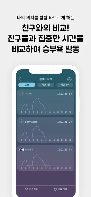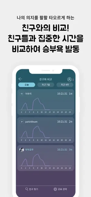 친구를 등록하면 친구들과 실시간, 주, 월별로 집중시간을 비교하고 친구들 사이에서 몇 등 했는지 알 수 있습니다.