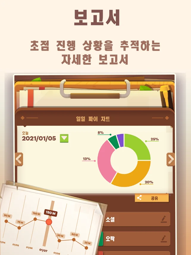일, 월, 별로 측정한 집중 시간을 분석하여 집중 시간이 향상되고 있는지 얼마나 목표 시간을 달성했는지 구체적으로 분석할 수 있고 분석한 통계를 다른 사용자와 공유 할 수 있습니다.