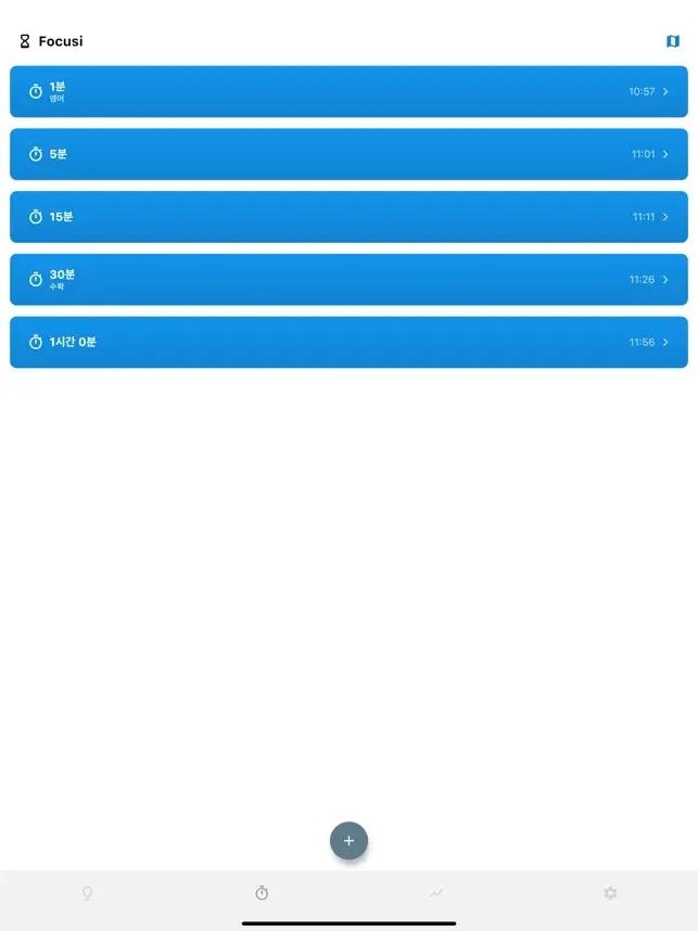 5분, 15분, 30분, 1시간 중 자신이 집중할 수 있는 시간을 설정하실 수 있습니다. 앱 사용에 익숙해지셨다면 자신의 루틴 타임을 추가해 보세요!