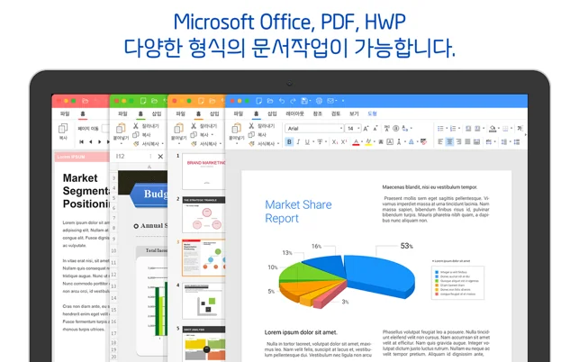 마이크로 소프트 워드(Word), 엑셀(Excel), 파워포인트(PowerPoint), 한글(HWP)과 같은 다양한 종류의 문서를 확인하고 편집할 수 있습니다.