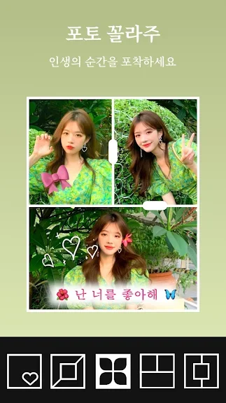 여러 사진을 선택만 하면 콜라주 & 사진편집어플 가 멋진 사진 콜라주로 즉시 리믹스해드립니다. 제일 마음에 드는 레이아웃을 선택하고 필터, 스티커, 텍스트 등으로 콜라주를 편집할 수 있습니다. 워터마크 없이 원하는 곳에서 쉽게 공유하세요!