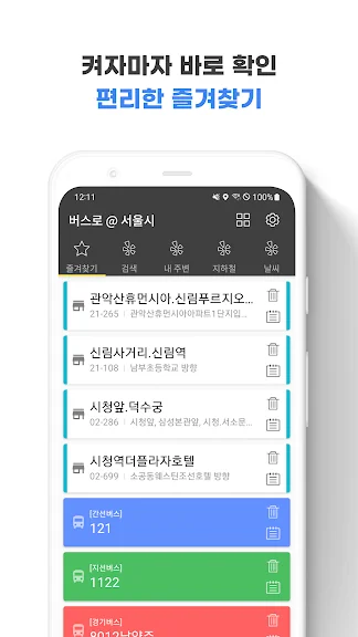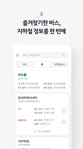 자주 이용하는 정류장, 지하철역을 즐겨찾기해서 홈에서 바로 확인해요.