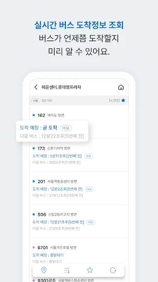 - 몇 분 뒤에 도착하는지, 버스가 어디쯤 있는지 실시간 정보를 직관적으로 제공해요.