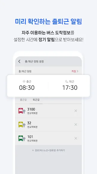 - 자주 탑승하는 버스 도착정보를 설정한 고정시간에 출퇴근 알람으로 받아보세요!