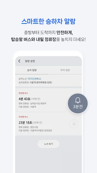 승차알람과 하차알람으로 놓칠 걱정 없이 버스를 이용하세요.