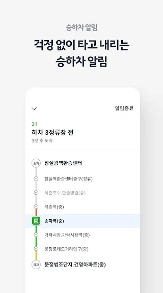 - 하차 할 버스 정류장을 설정하면 목적지에 도착하기 전 진동으로 알림을 받을 수 있어요.