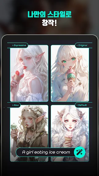 "시부야에서 아이스크림을 먹고 있는 물속 애니메이션 소녀" 또는 간단한 단어로 "하늘에 있는 고양이 19마리"처럼 니지에게 보고 싶은 걸 말하고, 마음에 드는 스타일을 선택하면, 즉시 니지가 창조하는 여러분의 아트워크를 볼 수 있습니다!