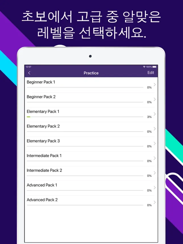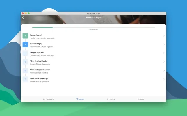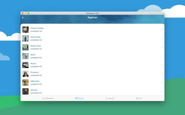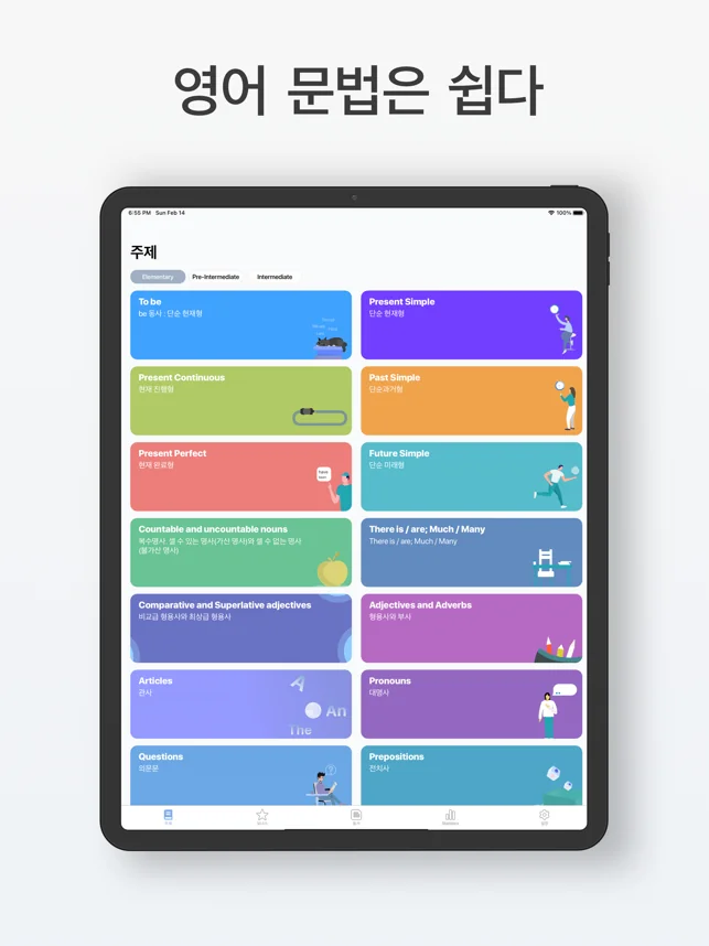 저희 앱은 모든 수준의 학습자에게 적합하며 기초(CEFR 레벨 A1), 초급, 중급, 고급(CEFR 레벨 C2) 단계로 나눠진 문법 학습과정을 제공합니다. 자신에게 맞는 단계에서 시작해서 문법 정확성이 올라가면 다음 단계로 넘어가세요.