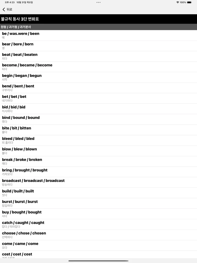 불규칙 동사와 발음을 함께 공부하며 다양한 언어로 된 번역 결과를 볼 수 있습니다.