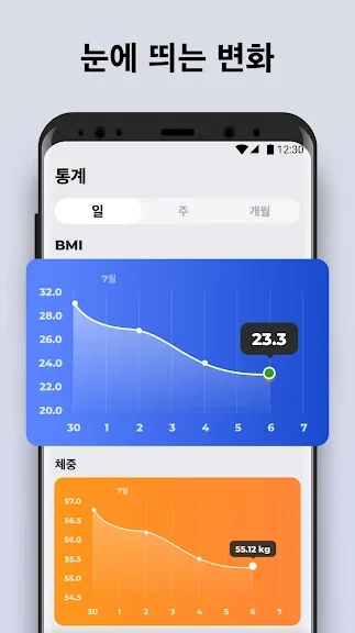 - 주간, 월간, 연간으로 몸무게, 체지방률, 그리고 BMI의 변화를 확인할 수 있어요.