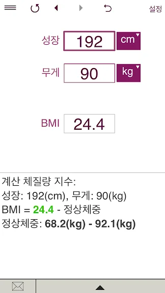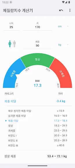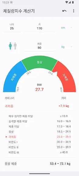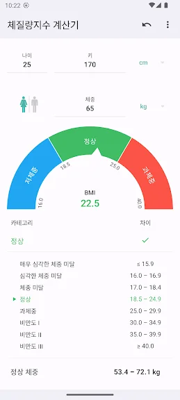 체질량지수 계산기 어플에 대한 스크린샷 정보가 필요하시다면 아래 이미지를 참고하시기 바랍니다.