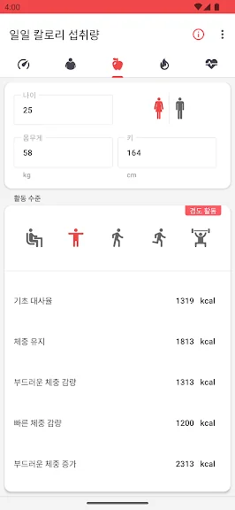 - 적당히 활동적 (가벼운 운동 / 주 3-5 회).