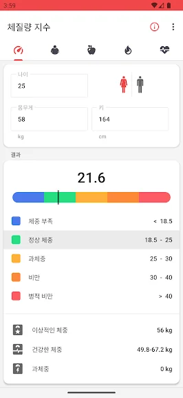 과체중 및 비만은 고혈압, 심장 질환 및 당뇨병과 같은 질병의 위험 요소이므로 이상적인 체중을 찾기 위해 신체 상태를 확인하십시오. 체중 감량이나 다이어트를 원한다면 건강한 체중을 찾아내는 데에도 사용할 수 있습니다.