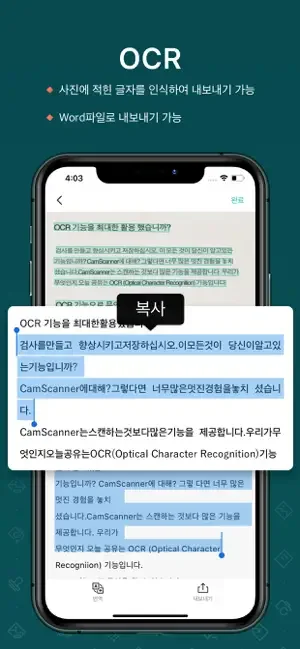 CamScanner는 여러분의 디바이스를, 텍스트를 자동으로 인식하는 (OCR, Optical Character Reader) 강력한 휴대용 스캐너로 만들어줄 뿐만 아니라, 근무와 일상생활 시에 더욱 생산성을 높일 수 있도록 도와줍니다.