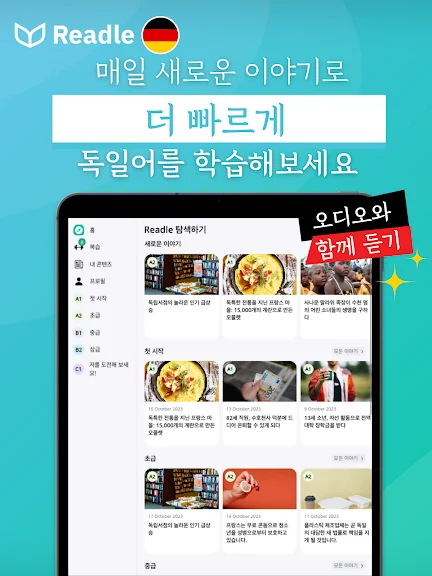 Readle독일어: 읽기, 듣기, 어휘, 사전 및 문법 어플에 대한 스크린샷 정보가 필요하시다면 아래 이미지를 참고하시기 바랍니다.