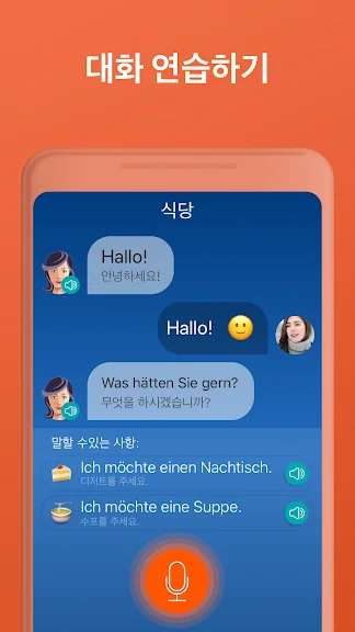 이 앱은 두 사람의 기본적인 대화로 시작됩니다. 신속하게 핵심 독일어 단어를 외우고 이 단어로 문장과 구를 만들어봅니다. 45분의 수업이 끝나면 회원님의 목소리로 이 대화를 재구성해 볼 수 있게 됩니다. 독일어 문장을 공부하는 아주 효율적인 방법입니다. 최신 음성 인식 기능과 분산 학습 알고리즘을 통해 더 효과적으로 언어를 학습할 수 있습니다.