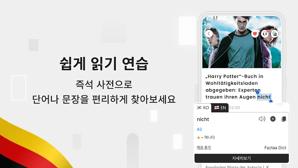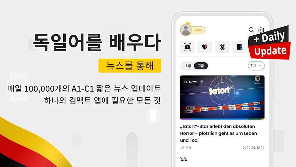 뉴스, 신문 기사를 통해 독일어 자습을 할 수 있는 애플리케이션입니다. 사용자가 독일어 듣기 - 말하기 - 읽기 - 쓰기 능력을 빠르고 효과적으로 향상할 수 있도록 쉬운부터 어려운 레벨까지 구분됩니다.