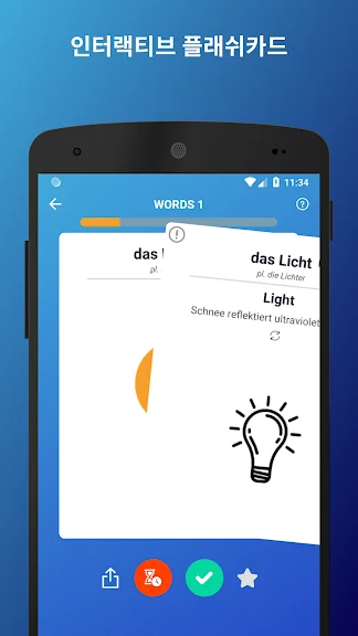 아직 단어가 외워지지 않았다면 왼쪽으로 밀어 나중에 다시 공부해보세요.