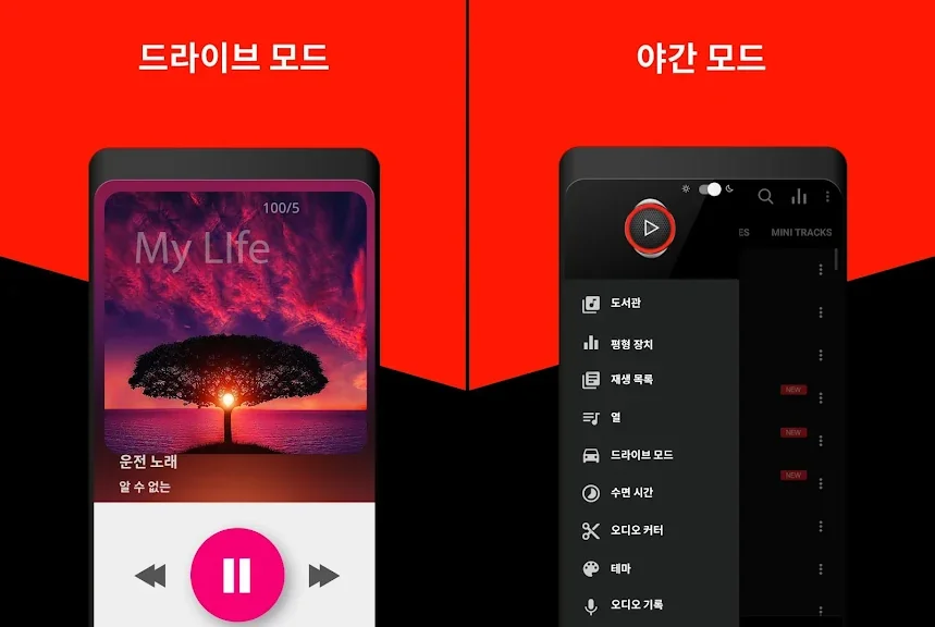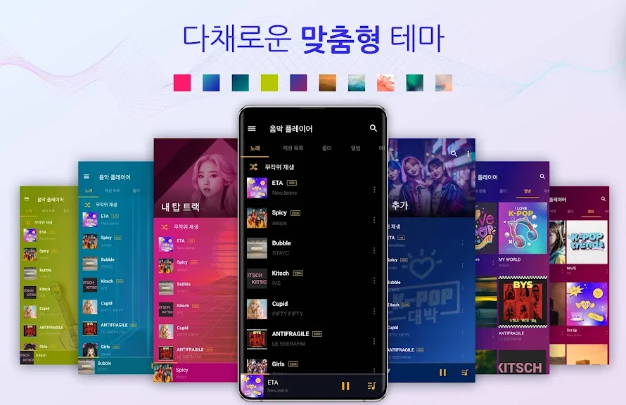 다크 모드와 여러 가지 플레이어 테마를 지원하는 뮤직플레이어 어플입니다. 앞으로 더 많은 테마가 추가될 예정입니다.