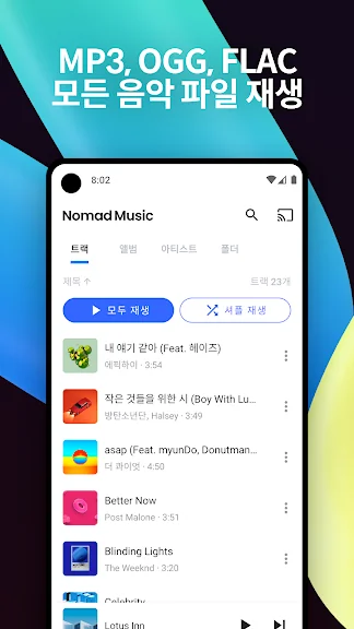 Nomad Music 앱은 아름다운 디자인의 유저 인터페이스는 물론, MP3, M4A, OGG, FLAC 등의 다양한 음원 포맷을 모두 지원하며 당신에게 최고의 오디오 경험을 제공합니다.