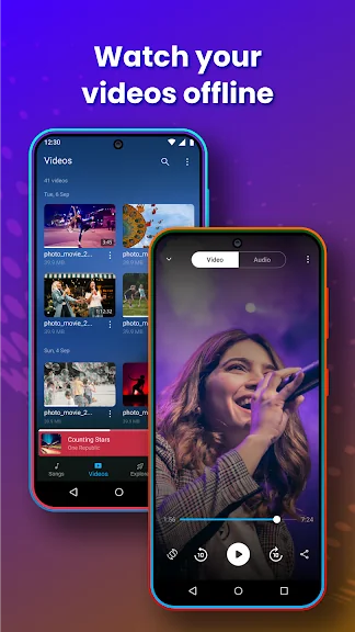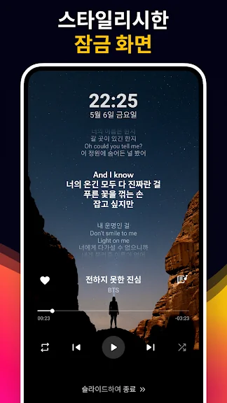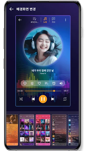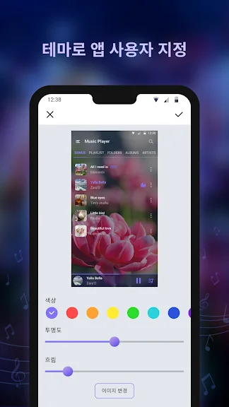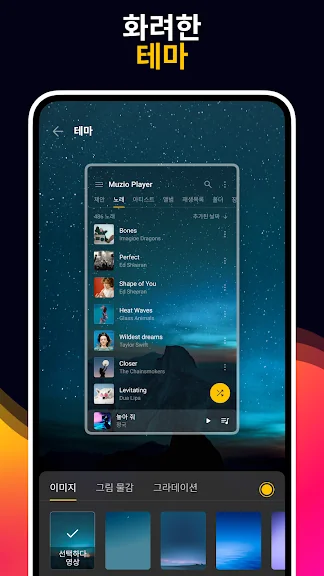세련되고 간단한 사용자 인터페이스로 음악 감상을 즐기세요. 뮤직 플레이어는 완벽한 선택입니다. 마음에 드는 색상 테마 또는 플레이어 테마 역시 선택할 수 있습니다.
