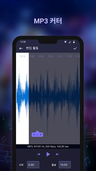 오디오 자르기 (MP3 커터) 기능을 이용해서 음악의 원하는 구간만 잘라 저장할 수 있습니다.