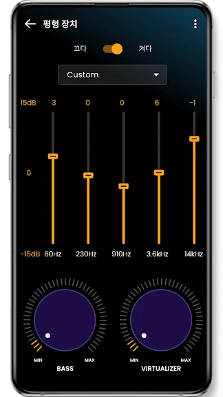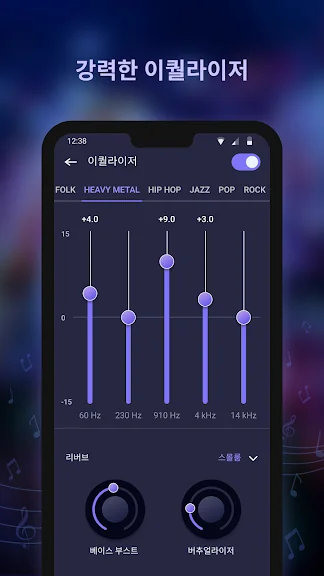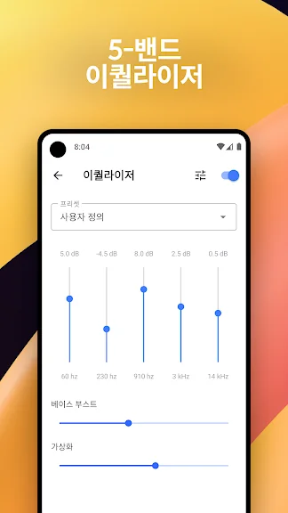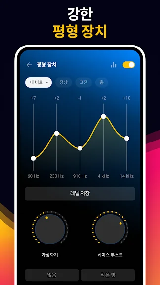 MP3 플레이어에 내장된 이퀄라이저로 음악 재생 경험을 향상시키세요. 10개의 무료 사전 설정, 5개의 밴드, 베이스 부스트, 가상화기 및 3D 리버브 효과 조정 등을 지원합니다.