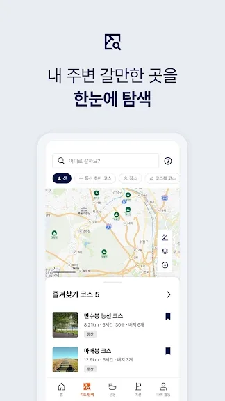 '경로 탐색' 기능을 이용하면 원하는 운동 종목에 맞춰 전국 어디든 경로를 사전에 탐색할 수 있으며, '주변 탐색' 기능을 통해 내 위치에서 갈만한 곳을 추천받을 수 있습니다. 또한, '지도 정보'는 탐방 시설, 편의 시설, 배지 위치 등 유용한 정보를 한눈에 제공해줍니다.