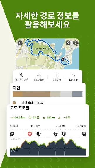 고른로드 라이딩용 아스팔트, 산악자전거 라이딩용 싱글 트랙, 조용한 투어용 자전거 전용 도로, 등산 및 하이킹용 트레일 중 원하는 스포츠에 맞는 경로를 찾아보세요. 지면, 난이도, 거리, 높이 정보 등을 쉽게 파악하여 플래너로 상세한 운동 계획을 세울 수 있답니다.