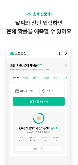 이 앱은 단순한 정보 제공을 넘어서, 등산을 더욱 즐겁고 효율적으로 만들어주는 기능들을 갖추고 있습니다. 등산에 필요한 모든 정보를 한 번에 제공하고, 산을 즐기고 싶은 사람들에게 강력히 추천합니다. 산을 자주 가거나 새로운 코스를 탐험하고 싶은 사람이라면 오늘등산을 꼭 다운로드해 보세요.