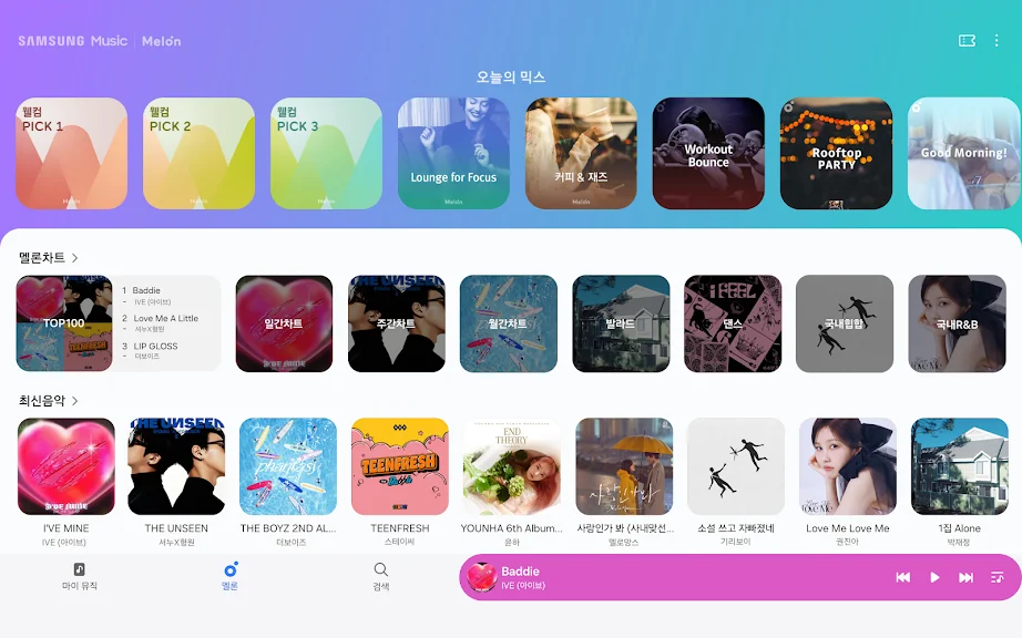 내 뮤직룸 곡, 앨범, 실시간 차트까지 감상해보세요.